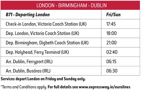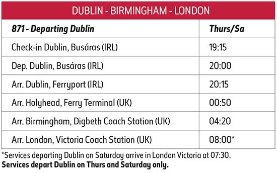- Now operating Thursdays and Saturdays to the UK from Busáras, Dublin. Returning from Victoria Coach Station, London to Dublin on Fridays and Sundays. Also serving Dublin Ferryport and Digbeth Coach Station, Birmingham.