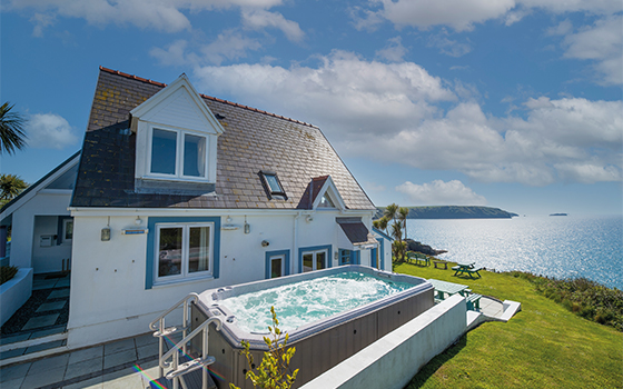 6 Bed cottage – Sleeps up to 12 Atlantic Sunset is a fantastic, detached house in a spectacular location above Little Haven Beach, only a 5-minute downhill walk away. Its elevated position ensures stunning views from nearly every room over the beach, St Brides Bay and the glistening sea; the palm trees gently swaying in the breeze gives it an almost Mediterranean feel. The amazing 14ft family swim spa set in a sheltered entertainment area with BBQ, it is sure to delight with six dedicated therapy massage seats allowing you to relax and enjoy aqua therapy even as the more energetic swim against a current in the 4ft deep pool - all while you savour the stunning sunsets over the sea. This property is ideal for families looking to take a break together